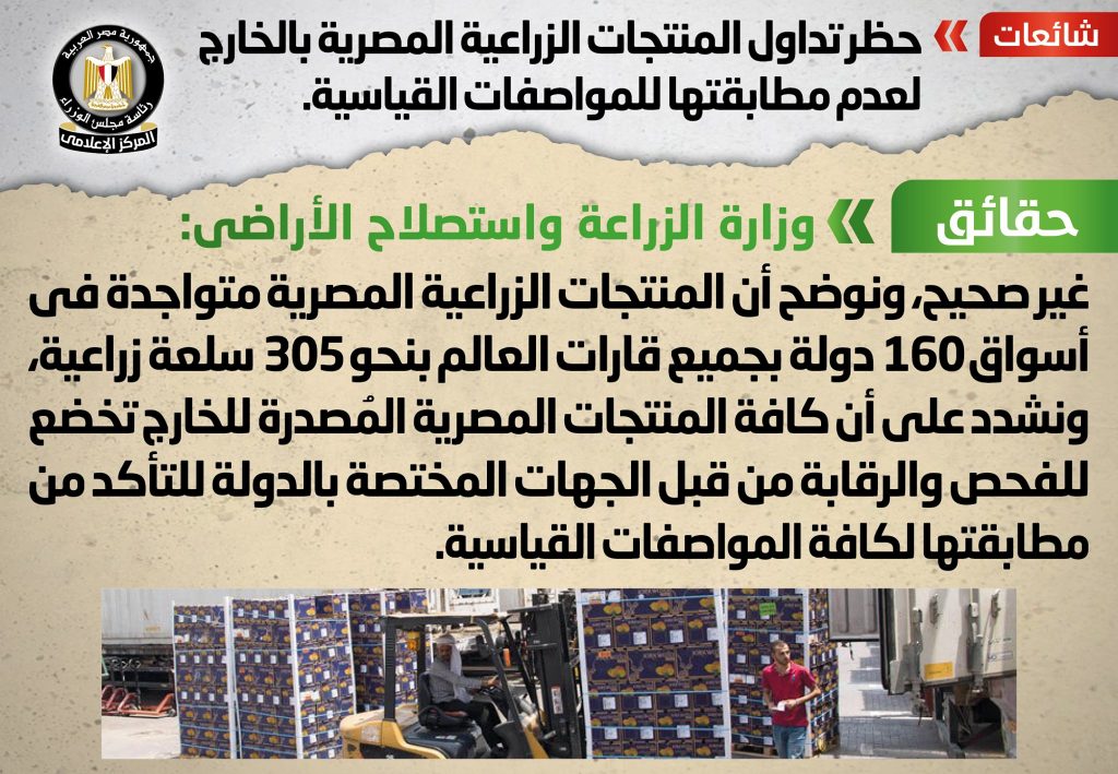 نفي المركز الإعلامي لمجلس الوزراء، ما تردد من أنباء بشأن حظر تداول المنتجات الزراعية المصرية بالخارج لعدم مطابقتها للمواصفات القياسية.